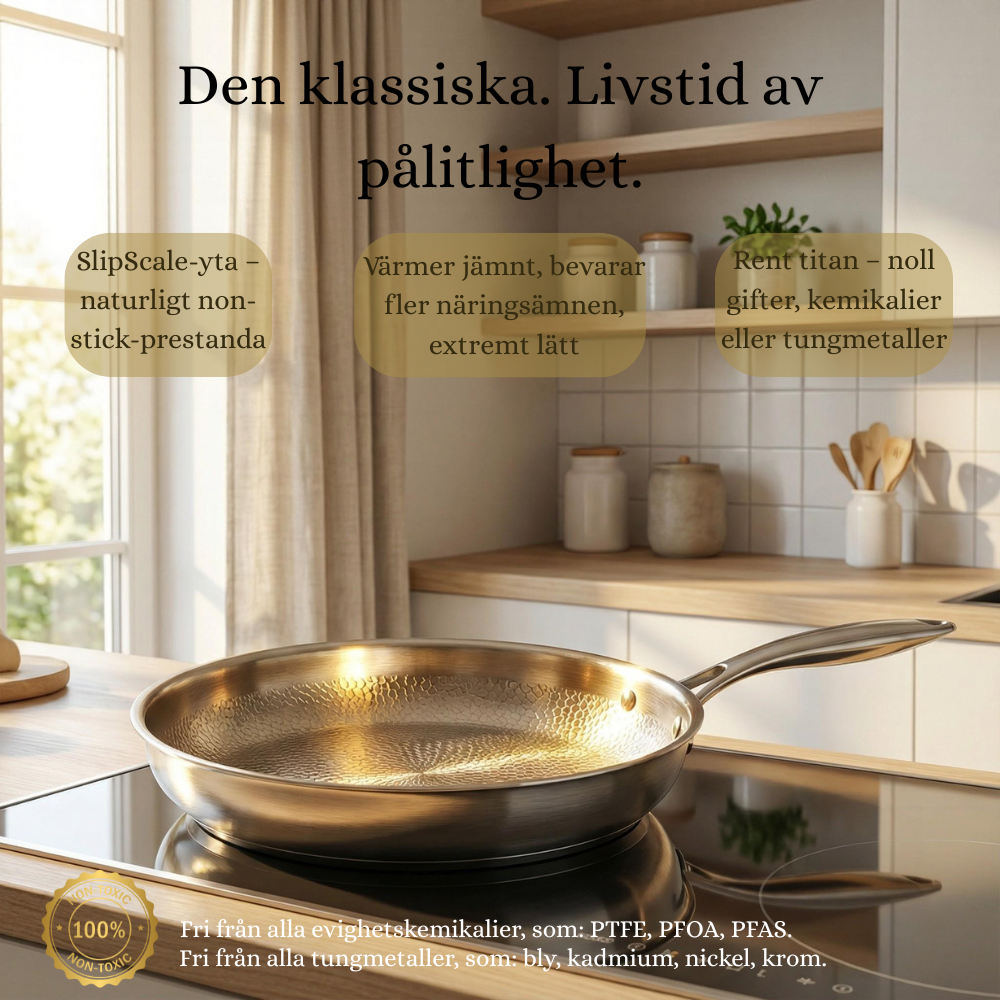 Tillverkad helt utan teflon eller andra coatingar. Endast massiv titaniumyta, utvecklad för höga temperaturer och daglig användning.